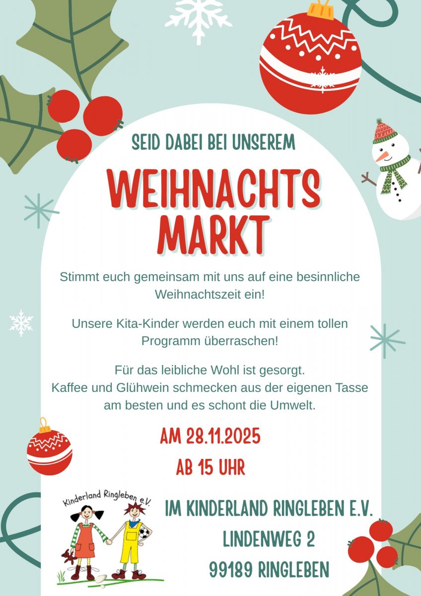 Wir, das Kinderland Ringleben e.V. sind eine Elterninitiative, die seit Januar 1996 besteht und ein freier Träger ist. Bei uns werden bis zu 45 Kinder im Alter von einem Jahr bis zum Eintritt in die Schule liebevoll betreut.