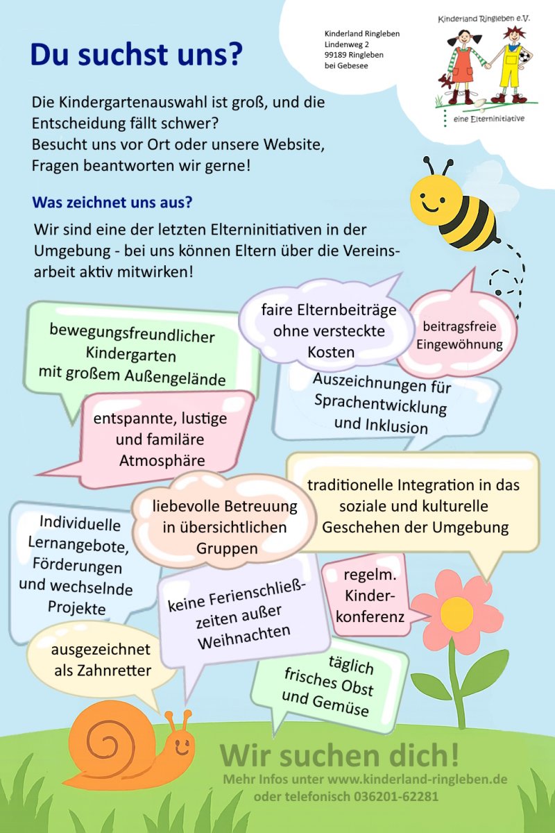 Wir, das Kinderland Ringleben e.V. sind eine Elterninitiative, die seit Januar 1996 besteht und ein freier Träger ist. Bei uns werden bis zu 45 Kinder im Alter von einem Jahr bis zum Eintritt in die Schule liebevoll betreut.