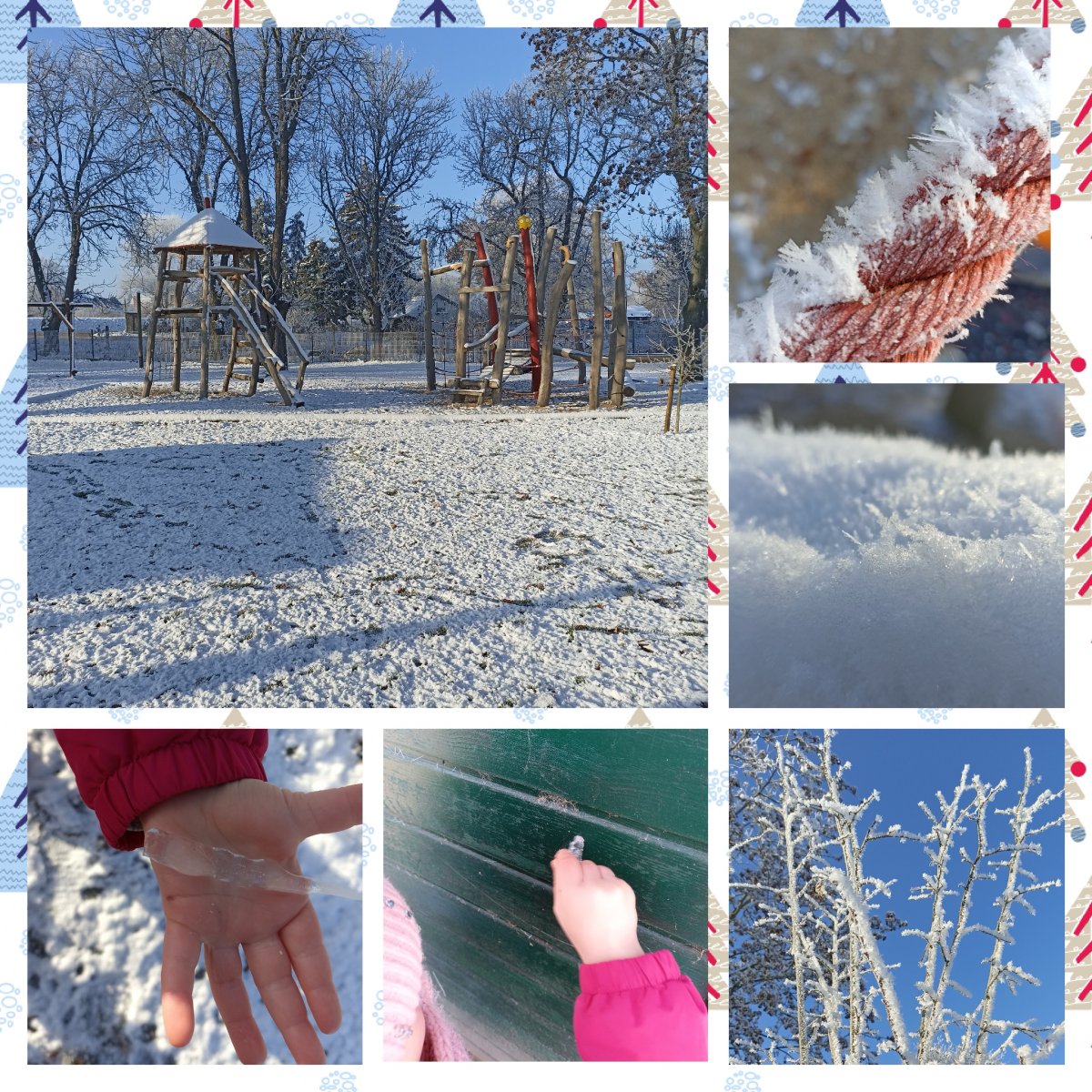 Das eisige Wetter hat uns heute nicht davon abgehalten im Garten zu spielen. Eingepackt in unsere Winter- und Schneeanzüge machten wir uns auf den Weg nach draußen. Dort erkundeten wir die Schneeflocken und den Frost. Man konnte die einzigartigen Flocken sehr gut beobachten. Die Kinder waren davon sehr erstaunt. Wir entdeckten und erforschten auch die "gefrorenen Spinnennetze". Das war faszinierend. Auf den Spuren der Tiere im Schnee, stießen wir auch auf Eiszapfen. Mit ihnen wurden nasse Kunstwerke erschaffen. Nach den erfolgreichen Experimenten, wärmten wir uns drinnen mit warmem Tee wieder auf.