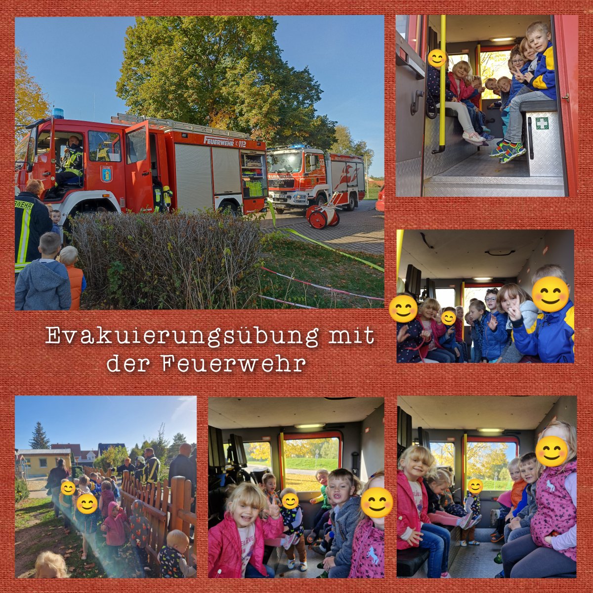 Es war einmal ein ruhiger Morgen im Kindergarten. Wir tanzen die Feuerwehrgymnastik und singen fröhlich mit. Doch plötzlich – ein grässlicher Piepton – der Rauchmelder! Was ist jetzt zu tun? Ich habe etwas Angst, weiß aber wohin ich gehen muss, da wir das gestern erst besprochen haben. Gemeinsam mit den anderen Kindern gehe ich hinüber in den Gruppenraum der Zwerge und stelle mich ruhig ans Fenster. In einer Reihe stehen wir dort. Annika öffnet das Fenster, schmeißt Matten heraus und gibt einen nach dem anderen hindurch. Micha nimmt uns draußen entgegen. Ich warte bis alle Kinder draußen sind. Wir gehen gemeinsam zum Sammelplatz am Kompost und warten auf die Wichtel. Kurz nach uns kommen auch sie heraus. Ohje, war das aufregend! Ich merke, dass ich immer noch etwas ängstlich bin, aber ich bin froh, dass wir jetzt in Sicherheit sind. Da schellt die Sirene der Feuerwehr durch meine Ohren. Sie ist laut, damit jeder sie hören kann. In einem Affenzahn fährt das rote Auto vor und hält plötzlich neben unserem Zaun. Die Feuerwehrmänner und –frauen springen heraus und rollen sofort lange Schläuche aus. Das alles fasziniert mich und ich bin umso beruhigter, denn…