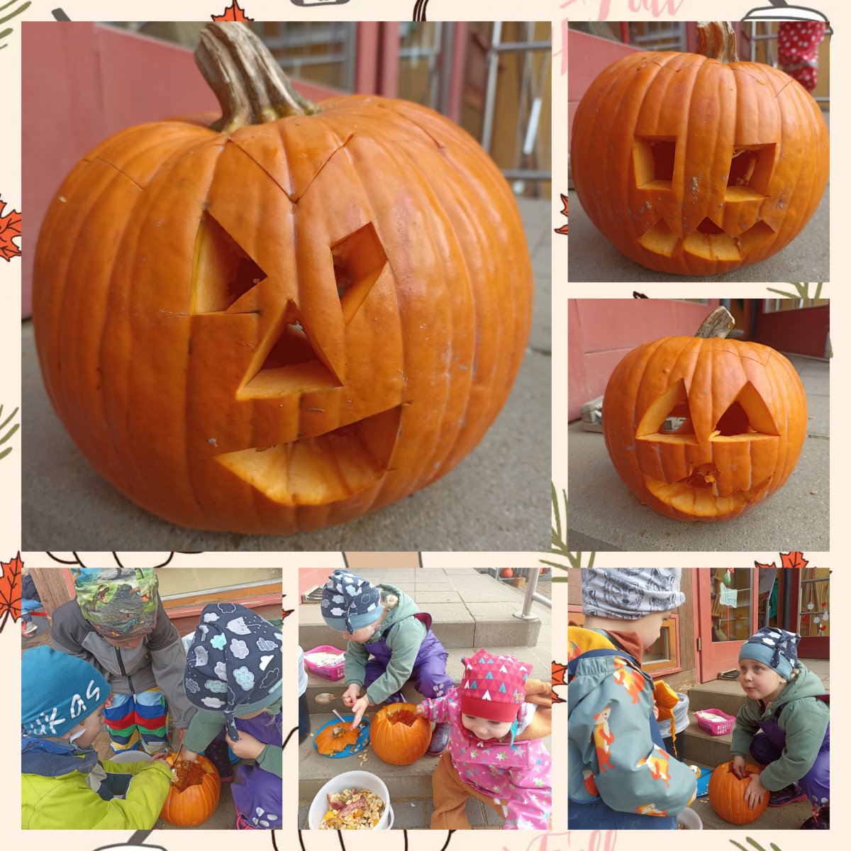 In dieser Woche beschäftigten wir uns mit den Jahreszeiten, insbesondere dem Herbst. Die Kinder hatten viele Fragen und suchten nach Antworten. Dadurch kam auch die Frage auf, welches Obst und Gemüse im Moment reif ist und geerntet werden kann. Mit den Kartoffeln kannten sich die Kinder bereits, dank unserer Ernte aus. Einige Kinder nannten daraufhin den „Kürbis“. Sie verbinden ihn mit Halloween und interessierten sich für das Ausschnitzen und Aushöhlen des Gemüses. Familie Wilde brachte uns daraufhin einen großen Kürbis mit, an dem sich die Kinder austoben konnten. Nachdem dieser oben geöffnet war, kamen die kleinen Hände schon zum Aushöhlen. Das machte großen Spaß. „Der fühlt sich von innen aber lustig an“, äußerten sie. Auch die Kürbiskerne erkannten die Kinder wieder. Sie kannten diese von Broten und Brötchen. Als das runde Gemüse ausgehöhlt war, ging es an die Filzstifte. Die Kinder zeichneten ihre lustigen Gesichter auf, die dann von der Erzieherin ausgeschnitzt wurden. Das zu beobachten weckte auch Begeisterung. „Guck mal, da kommt das große Messer in den Kürbis.“, „Da ist es schon wieder.“ …. Waren die Kommentare. Die Kinder konnten dabei ihr Wissen über heimisches Gemüse im Herbst erweitern und die Bestandteile des Kürbisses kennenlernen und entdecken. Außerdem macht es Freude etwas selbstgemachtes zu präsentieren.