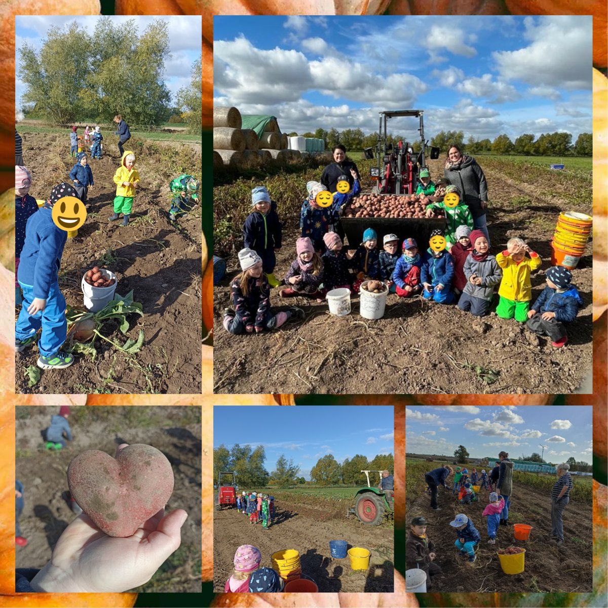 Am 06.10.2022 hieß es wieder „Ran an die Kartoffeln“, denn wir waren zur Kartoffelernte bei Familie Nessel eingeladen. Die Kinder freuten sich riesig und gingen, gekleidet in Matschhose und Gummistiefel, mit viel Eifer los zum Kartoffelfeld. Dort angekommen beobachteten wir die sogenannte „Kartoffelschleuder“ bei der Arbeit. Das freigelegte Gemüse konnte nun von uns geerntet werden. Alle Kinder stürzten sich aufs Feld und sammelten viele Eimer voll. Diese schütteten sie dann in die Schaufel vorn am Traktor. Die Kinder waren unermüdlich und fanden eine Kartoffel nach der anderen. So waren auch ein paar besondere Exemplare dabei. Ein Herz wurde gefunden, „eine Kartoffel mit Kopf“, „ein Daumen“, „ein Baby“ und viele weitere tolle Dinge, entdeckten die Kinder. Nebenbei konnten wir einiges über die Ernte lernen. Wir sammelten so lang, bis die Schaufel randvoll mit dem leckeren Gemüse war. Das war anstrengend, aber sehr schön! Wir bedanken uns bei Familie Nessel dafür, dass wir auch in diesem Jahr wieder bei der Ernte helfen und Kartoffeln mit in den Kindergarten nehmen durften.