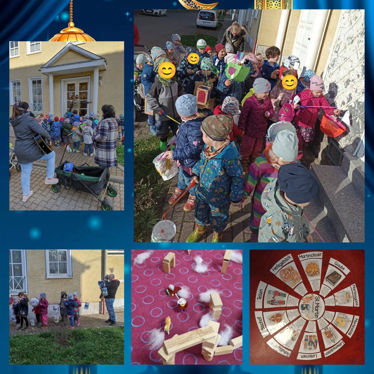 Beim Martini-Umzug durch Ringleben. Das St. Martinsfest beschäftigte uns nun schon einige Zeit. Im Morgenkreis klärten wir, warum wir dieses Fest feiern und wer eigentlich dieser Martin ist, von dem alle sprechen. Nachdem die Kinder herausfanden, dass Martin von Tours um die Jahre 314-316 geboren wurde, war ihnen klar, dass es nicht die gleichnamigen Papas sein konnten, die uns hier beschäftigten. Die Geschichte von St. Martin faszinierte uns. Die Kinder staunten darüber, dass er so gut zu den Menschen war und den Armen alles gab, damit es ihnen besser geht. In einer Legegeschichte stellten die Wichtel jenen bekannten Abend nach, an dem Martin seinen Mantel mit einem Bettler teilte. Eine Legofigur verwandelte sich in den heutigen Schutzpatron und bekam ein Schwert und einen Helm aus Alufolie und einen Mantel, den man teilen konnte. Auch die Zwergen- und Riesengruppe beschäftigte sich mit dieser Geschichte. Sie veranschaulichten die Bräuche des Martinstages in einem Legekreis. Natürlich durften die bunten Laternen nicht fehlen. Alle Kinder bastelten schöne Schmuckstücke. Die Wichtelgruppe bemalte bunte und glitzernde Papierlaternen, die Zwergengruppe verzierte ihre Holzlaternen mit Schmucksteinen und die Riesengruppe bastelte bunte und gefährliche Schiffslaternen. Mit diesen zogen wir dann am 10. November durch Ringleben. Wir hielten bei einigen Häusern an, klingelten und sangen tolle Lieder. So auch „Kommt, wir woll´n Laterne laufen“, was die Kinder fleißig seit einigen Wochen einstudiert hatten. Über den Gesang freuten sich viele Omas und Opas, Bekannte sowie Verwandte. Sie beschenkten uns mit zahlreichen Leckereien. Auch vom Bäcker „Lorenz“ erhielten wir köstliche Martinshörnchen. Strahlende und glückliche Kinderaugen zogen nach dem Marsch wieder in den Kindergarten.