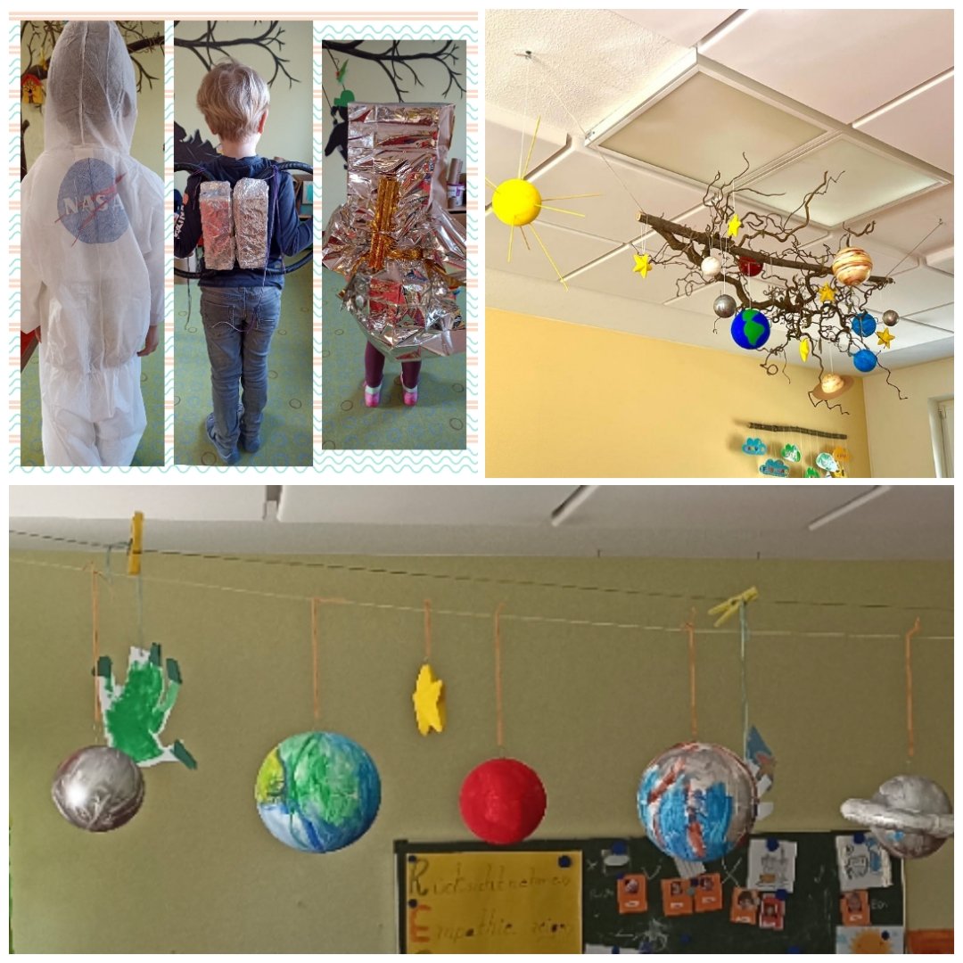 Mitbestimmung ist unser Motto hier im Kinderland. So entstand auch unsere Projektwoche im März. Die Kinder äußerten den Wunsch einer Projektwoche zum Thema "Weltall". Vom 21.-25.03.2022 wagten die Riesen und Zwerge dann einen großen Schritt in die Ferne des Universums. Zu Beginn der Woche überraschten uns viele Kinder mit ihren selbstgebastelten Raumanzügen, mit denen sie in den Kindergarten kamen. Darin steckte viel Mühe und alle Kinder sahen klasse aus! So starteten wir in ein aufregendes Projekt und eine ganze Woche klärten wir Fragen, wie: