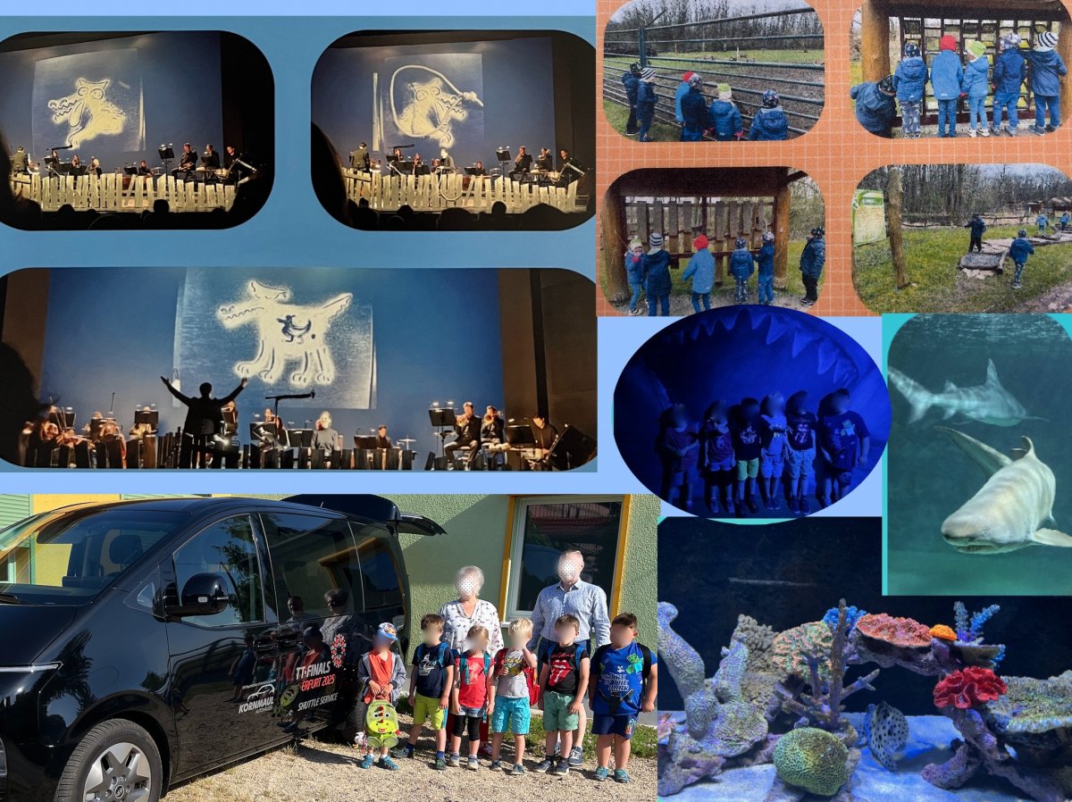 Zu unserem letzten Ausflug im Juni holte uns Herr Fiedler mit dem Kleinbus vom Autohaus Kornmaul Weimar im Kindergarten ab. Gemeinsam starteten wir nach Zella Mehlis ins Meeresaquarium. Dort angekommen, kamen wir aus dem Staunen nicht mehr heraus! So viele bunte Fische und andere Meeresbewohner! Aber am beeindruckendsten waren die großen Haie. Manche zeigten uns sogar ihre scharfen Zähne. Von einer Brücke aus, beobachteten wir die Krokodile. Lustig waren die vielen Koi’s, die wir füttern durften. Auf dem Spielplatz tobten wir uns noch ein bisschen aus. Dann fuhren wir zurück in den Kindergarten.