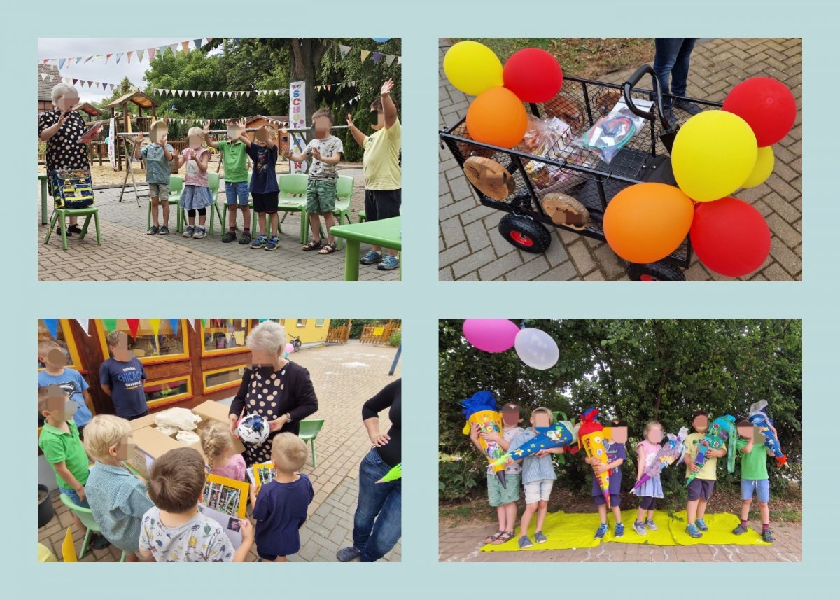 Zurück im Kindergarten trauten die Schulanfänger Ihren Augen nicht. Der Zuckertütenbaum hatte die alten Zuckertüten abgeworfen. Stattdessen lagen dort große, bunte und gefüllte Zuckertüten, die die Äste von dem Baum nicht mehr tragen konnten. Die Eltern haben dem Kindergarten zum Abschied einen Handwagen für das ganze Sandspielzeug geschenkt. Von Gabi bekam jeder einen richtig tollen Fußball mit den Unterschriften der Erzieherinnen geschenkt. Nach dem Abendessen hatten alle noch viel Spaß. Einige Schulanfänger übernachteten im Kindergarten. Das war ein wunderschöner, aufregender Tag!