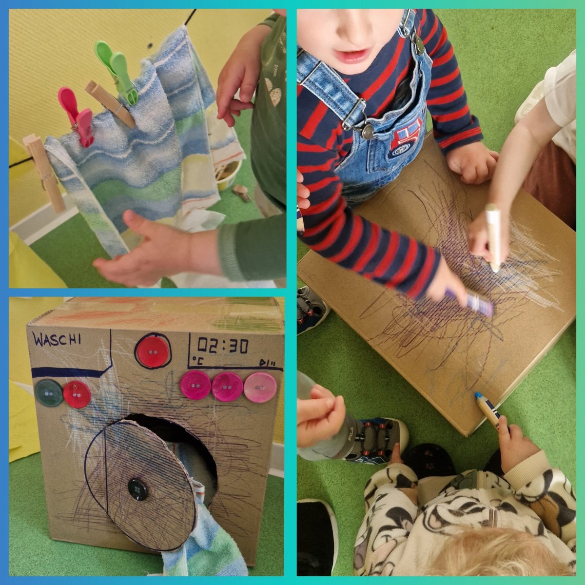Auch in diesem Jahr durften wir wieder auf die tatkräftige Unterstützung der Eltern zählen, die uns mit vielfältigen Alltags- und Naturmaterialien versorgten. Die Kinder zeigten dabei erneut ihre beindruckende Kreativität und Fantasie. So entstanden aus großen Pappkartons fantasievolle Häuser, ein Herd mit Backofen und eine selbstgebaute Waschmaschine. Ein weiteres Highlight waren sensorische Luftballons und Überraschungseier, die mit unterschiedlichen Materialien gefüllt wurden. Für Rollenspiele standen liebevoll vorbereitete Eissorten zur Verfügung: Aus Schwammtüchern, Holzstielen, Eierkartons und bunter Wolle entstanden kreative Eiskreationen, die zum fantasievollen Spiel einluden. Die Wolle wurde aber nicht nur für Eis genutzt, sondern auch zerschnitten und als Spaghetti serviert.