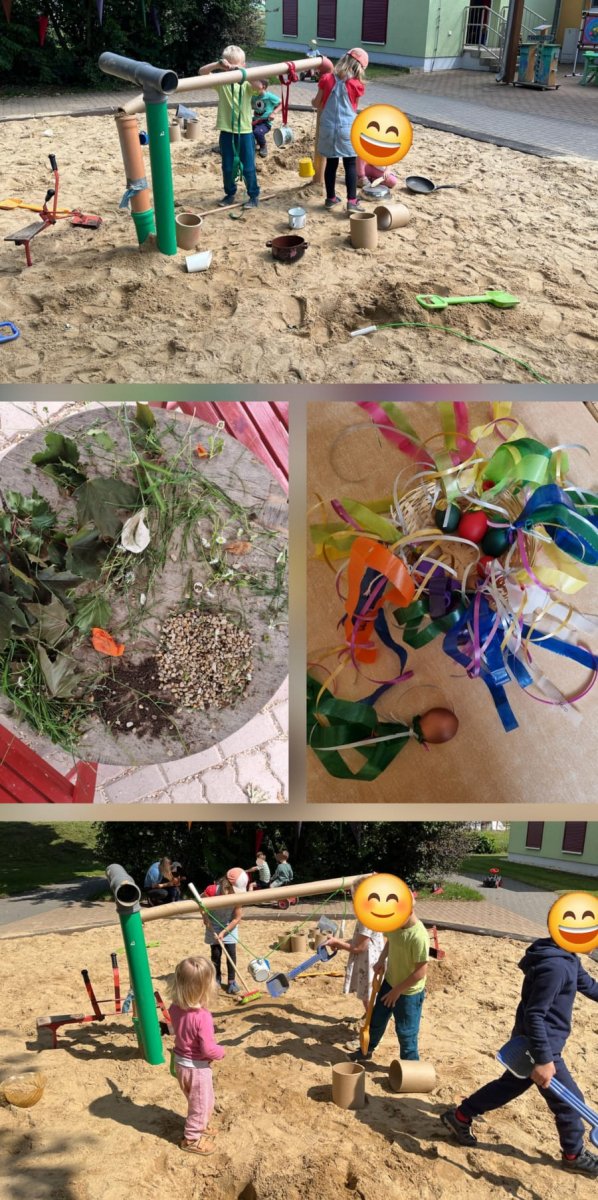 Auch im Außengelände gab es vieles zu entdecken, das uns bisher gar nicht aufgefallen war. In der Sandkiste beispielsweise, verlegten die Kinder mit großem Eifer kleine Rohrsysteme. Ein wichtiger Bestandteil des Konzeptes der spielzeugfreien Zeit, sind zudem die regelmäßigen Ausflüge in die Natur. Naturmaterialien wurden gesammelt und in kreative Rollenspiele eingebunden. Auch Lernangebote mit Naturmaterialien machten großen Spaß und sorgten für willkommene Abwechslung.