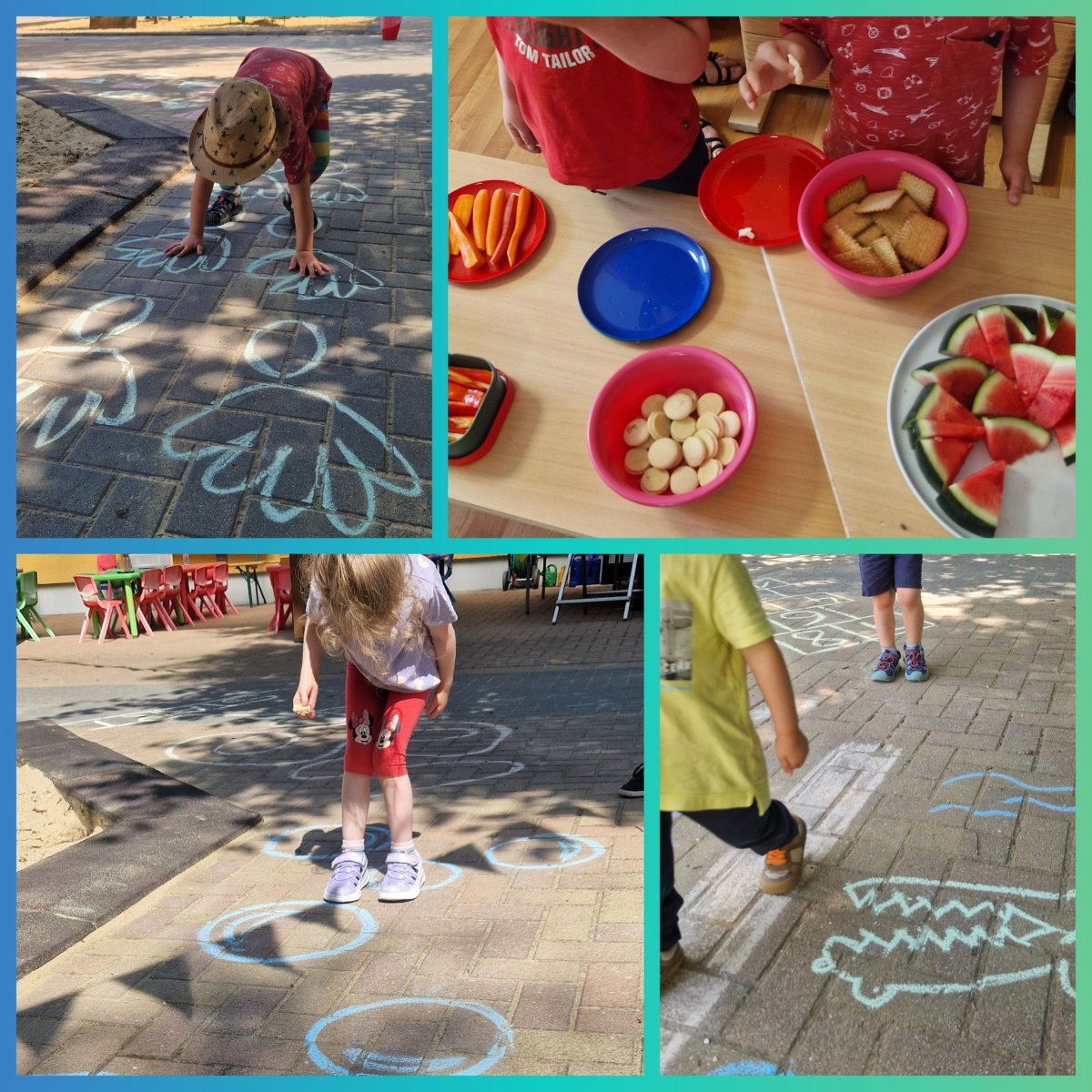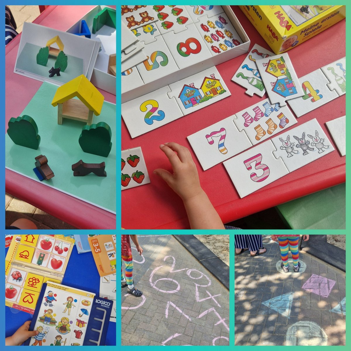 Einmal im Monat treffen sich Kinder, Eltern und Erzieherinnen zum Spielecafé im Kinderland Ringleben. Am 17.06.2025 drehte sich bei uns alles um das Themengebiet Mathematik. Auf spielerische Art und Weise entdeckten wir Farben, Formen und Zahlen. Wir haben gemeinsam gepuzzelt, gewürfelt, Rätsel gelöst und gezählt. Ein besonderes Highlight für die Kinder war der Kreideparcours, den die Erzieherinnen im Hof vorbereitet hatten. Hier wurde die mathematische Bildung eng mit der Bewegungserziehung verbunden und bereitete den Kindern besonders viel Freude. Zwischendurch haben wir uns mit Obst, Gemüse und Keksen gestärkt, die uns die Eltern mitgebracht haben. Eltern, Kinder und Erzieherinnen haben freudvoll zusammen gespielt und sind miteinander ins Gespräch gekommen. Vielen Dank an alle Teilnehmer für diesen wunderschönen und lustigen Nachmittag. Wir freuen uns auf das nächste Spielecafé im Kinderland Ringleben e.V.