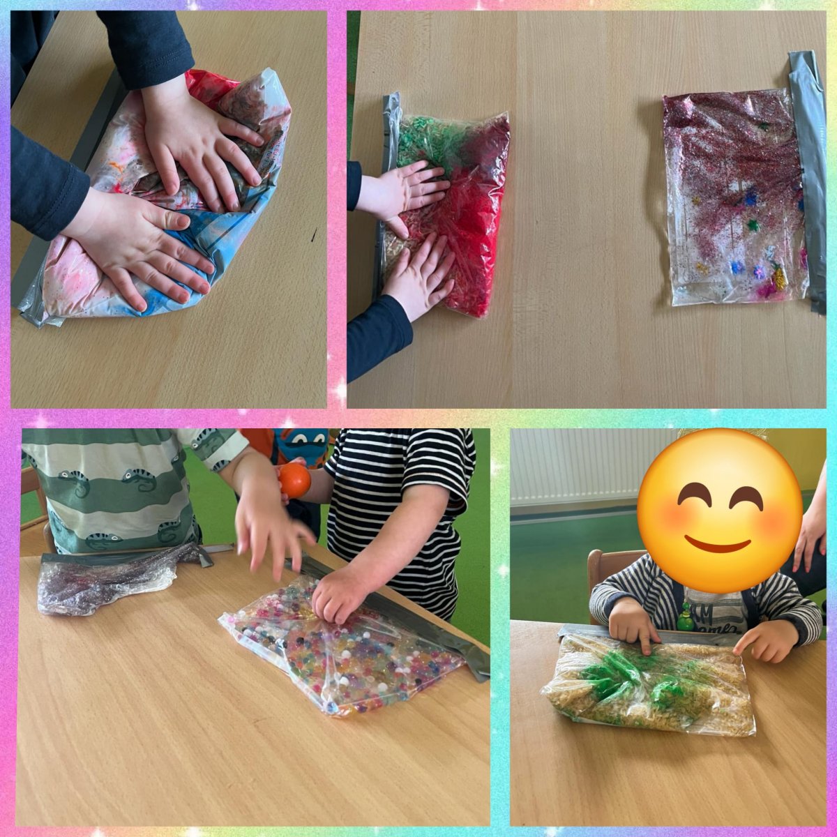 Gemeinsam bereiteten wir am Vormittag sogenannte "Sinnesbeutel" vor. In Gefrierbeutel wurden verschiedene Materialien, wie Reis, Rasierschaum, Haargel oder Wasserperlen, gefüllt. In einige Beutel fügten die Kinder Farbe und Glitzer hinzu. Das allein war schon ein riesen Spaß. Nach dem Verschließen der Beutel, lagen sie zum experimentieren bereit. Die Kinder konnten hier mit den Händen oder einzelnen Fingern die Materialien vermischen. Besonders spannend fanden die Kinder den Rasierschaum. "Fühlt sich an wie Wolken", berichteten die Größeren. Die Wichtel lernten hierbei unterschiedliche Konsistenzen kennen, fühlten Unterschiede (wie weich und hart), haben Gerüche wahrgenommen und Mischfarben beobachtet. Auch die Feinmotorik wurde sowohl beim Einfüllen der Materialien, als auch beim Tasten im Beutel, gefördert. Das Wichtigste aber war: Die Kinder hatten riesigen Spaß.