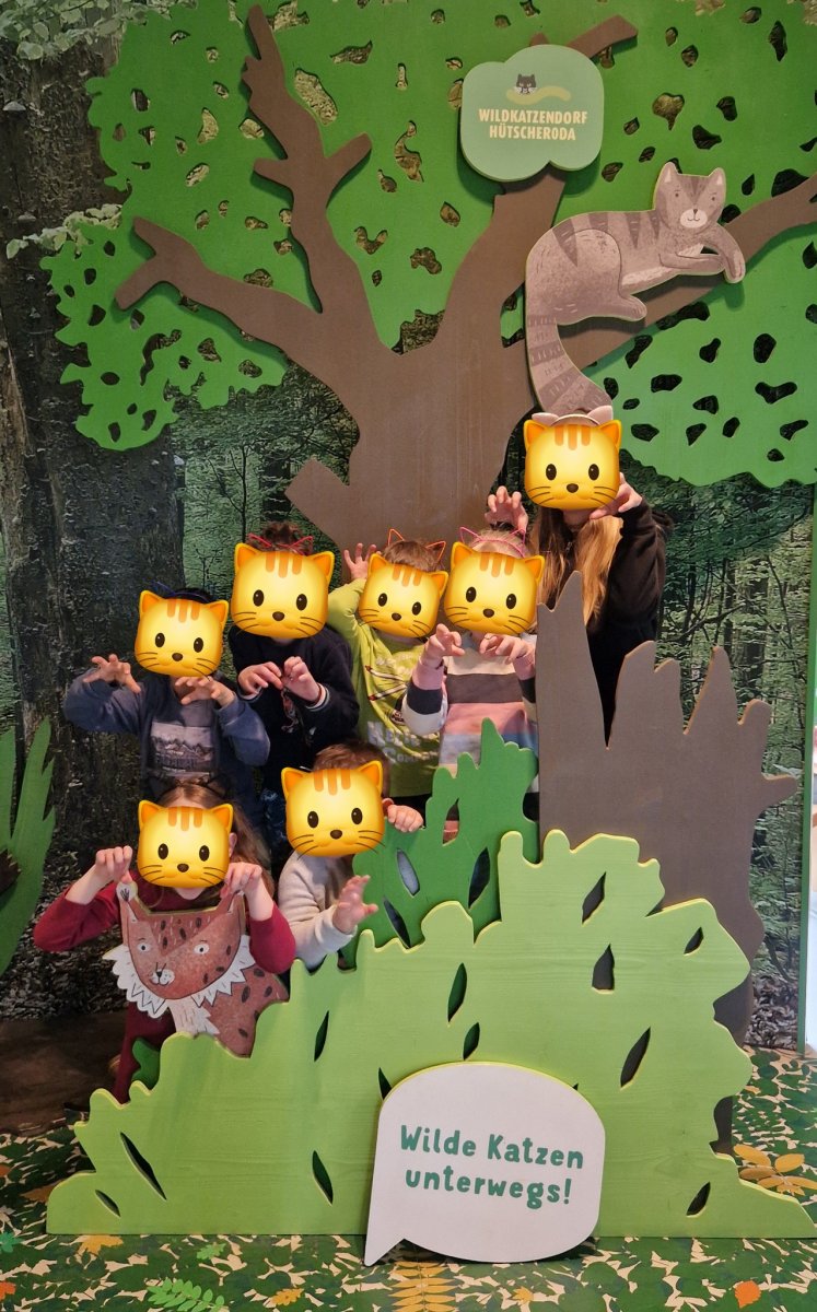 Am 25.04.2024 sind wir nun zu unserem dritten Vorschulausflug aufgebrochen, diesmal ins Wildkatzendorf Hütscheroda. Nach einer sehr entspannten Busfahrt, auf der wir super die Naturveränderungen beobachten konnten, die der Frühling bringt, kamen wir halb 10 im Wildkatzendorf an. Erstmal haben wir die Wildkatzenscheune erkundet und dabei auch schon die ersten Wildkatzen entdeckt. Die waren natürlich nicht lebendig, sondern ausgestopft. Wir erfuhren viele interessante Dinge über Luchse und Wildkatzen, zum Beispiel wie sie aussehen, was sie fressen und wo sie leben. Nach einem spannenden Kurzfilm über Luchse, ging es endlich zum Wildkatzengehege. Zunächst konnten wir nichts weiter sehen als Bäume und Blätter. Doch als ein Mitarbeiter des Wildkatzendorfes Futter im Gehege verteilte, konnten wir beobachten wie die Wildkatzen langsam aus ihren Verstecken geschlichen kamen. Langsam kamen sie näher und dann ZACK, haben sie sich die Leckerbissen geschnappt. Die Katzen waren sehr flink und konnten auf den dünnen Ästen richtig gut balancieren und klettern. Das war wirklich unglaublich! Beim Luchs-Gehege haben wir auch noch Halt gemacht, obwohl wir nicht glaubten einen von ihnen zu sehen. Denn im Kurzfilm haben wir gelernt, dass Luchse sehr scheu sind und sich dazu noch prima tarnen können. Deshalb ist es nahezu unmöglich einen zu erspähen. Daher trauten wir unseren Augen kaum, als wir ganz hinten im Gehe hinter einem dicken Baumstamm ein Paar Ohren mit Pinselhaaren entdeckten. Er war zwar weit weg, aber wir können nun mit Stolz sagen, dass wir einen echten Luchs gesehen haben!