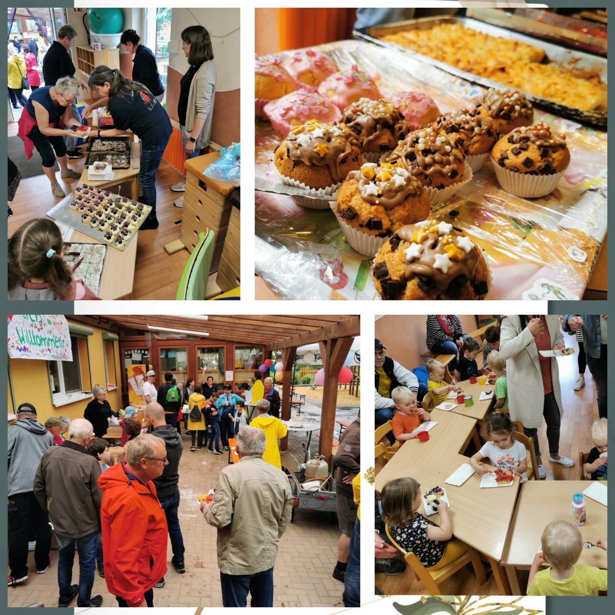 Auch in diesem Jahr öffneten wir die Türen unseres schönen Kindergartens wieder für alle (werdenden) Eltern, Großeltern, Bekannten und alle, die gern mal vorbei schauen wollten. Leider hat uns das Wetter kurz vor Beginn einen Streich gespielt und es regnete ohne Pause. Doch hier waren die lieben Eltern schnell zur Stelle und brachten uns zwei Pavillons vorbei. Wegen des Regens verlegten wir unser Programm in den Turnraum und die Kinder präsentierten voller Stolz ihre Tänze und das Fingerspiel. Sie trugen ein Gedicht über einen Frosch vor und tanzten ausgelassen zu "Wenn der Elefant in die Disco geht". Der krönende Abschluss des Programms war das Lied "Dorfkind", welches wir umgedichtet haben. Der Text passt nun zum schönen Ringleben. Nach dem tosenden Applaus läuteten wir einen aufregenden Nachmittag ein. Bei Kaffee und Kuchen saßen alle gemütlich beisammen und konnten sich anschließend die Räumlichkeiten ansehen. Eine Tombola bot einige Preise, die Spielsachen im Kindergarten wurden rege genutzt und beim Kinderschminken konnte sich jeder bunt anmalen lassen. Hier sahen wir leuchtende Kinderaugen. Wir freuen uns jedes Jahr sehr, wenn werdende Eltern oder jene, die einen Kindergartenplatz suchen oder auch die Anwohner aus Ringleben, bei uns vorbeischauen. Den Abend ließen wir bei leckerem Grillgut und Getränken ausklingen. Ein großes Dankeschön geht an alle Eltern. Ohne euch könnten wir so einen Tag nicht veranstalten. Danke für das Kuchen Backen, die Hilfe bei der Organisation und an den Ständen, fleißige Hilfe beim Aufräumen,... . Der Tag bleibt uns in Erinnerung und wir freuen uns schon, wenn Sie nächstes Jahr wieder vorbeischauen.